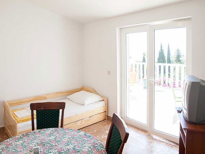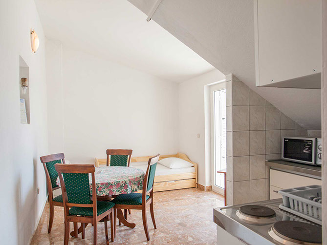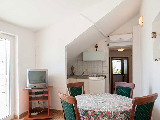 Apartment Mimosa has a dining room connected with kitchen, bedroom and bathroom.